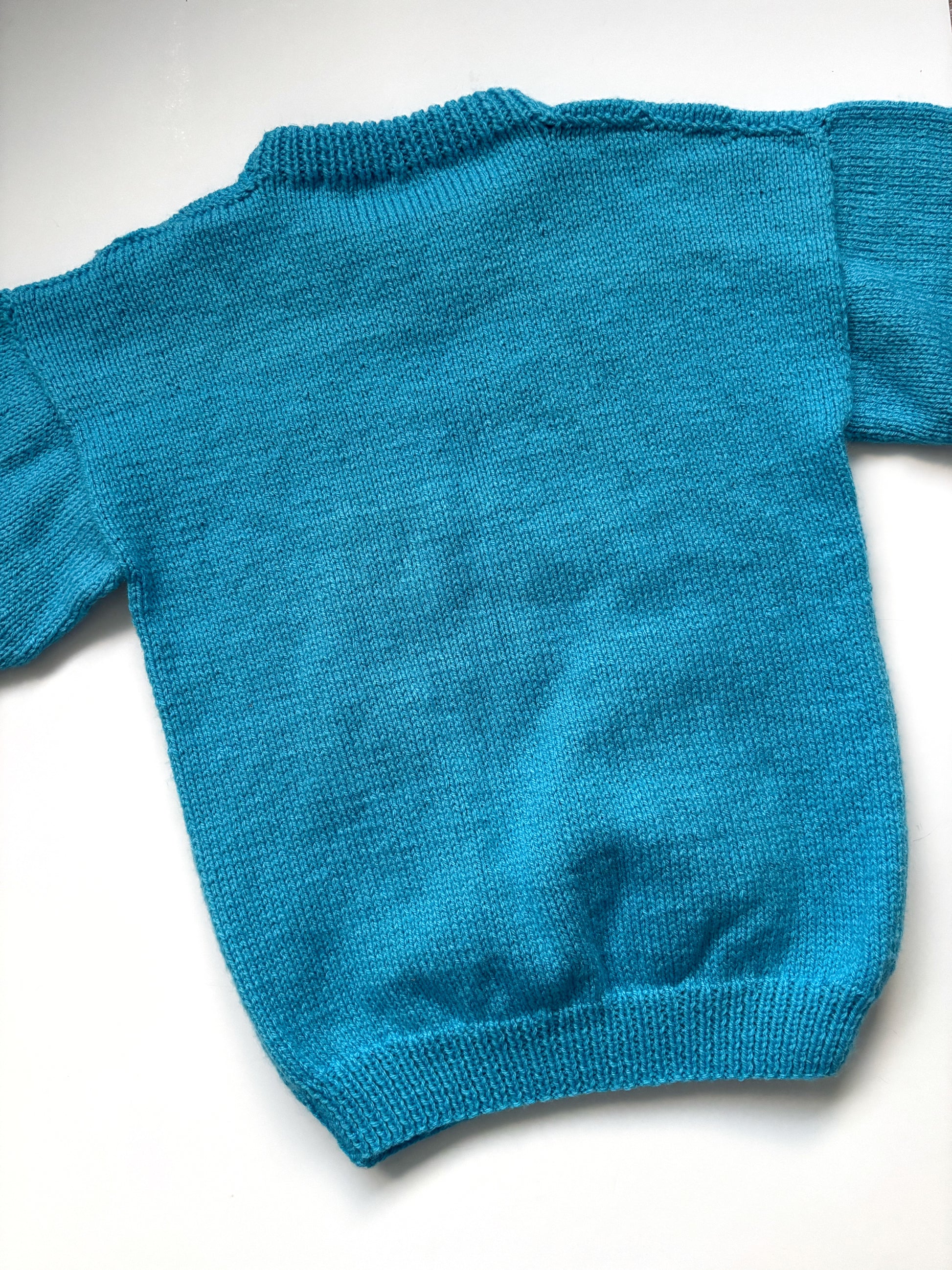 Amazing jumper!!! Hand knit with a lovely Santa design. It measures up to about an age 4-5 years. On smaller kids it would probably be oversized. It looks great oversized or snug. Really cool jumper. Great condition.